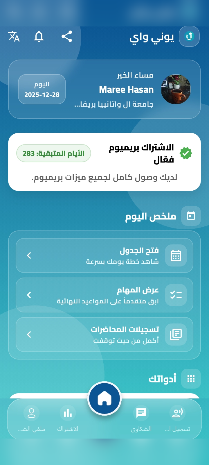 Uni‑Way يساعدك تنظّم جدولك ومهامك، تسجّل محاضراتك وتحولها إلى نص، وتذاكر مع الأصدقاء عبر مجموعات الدراسة والشات الجامعي.
