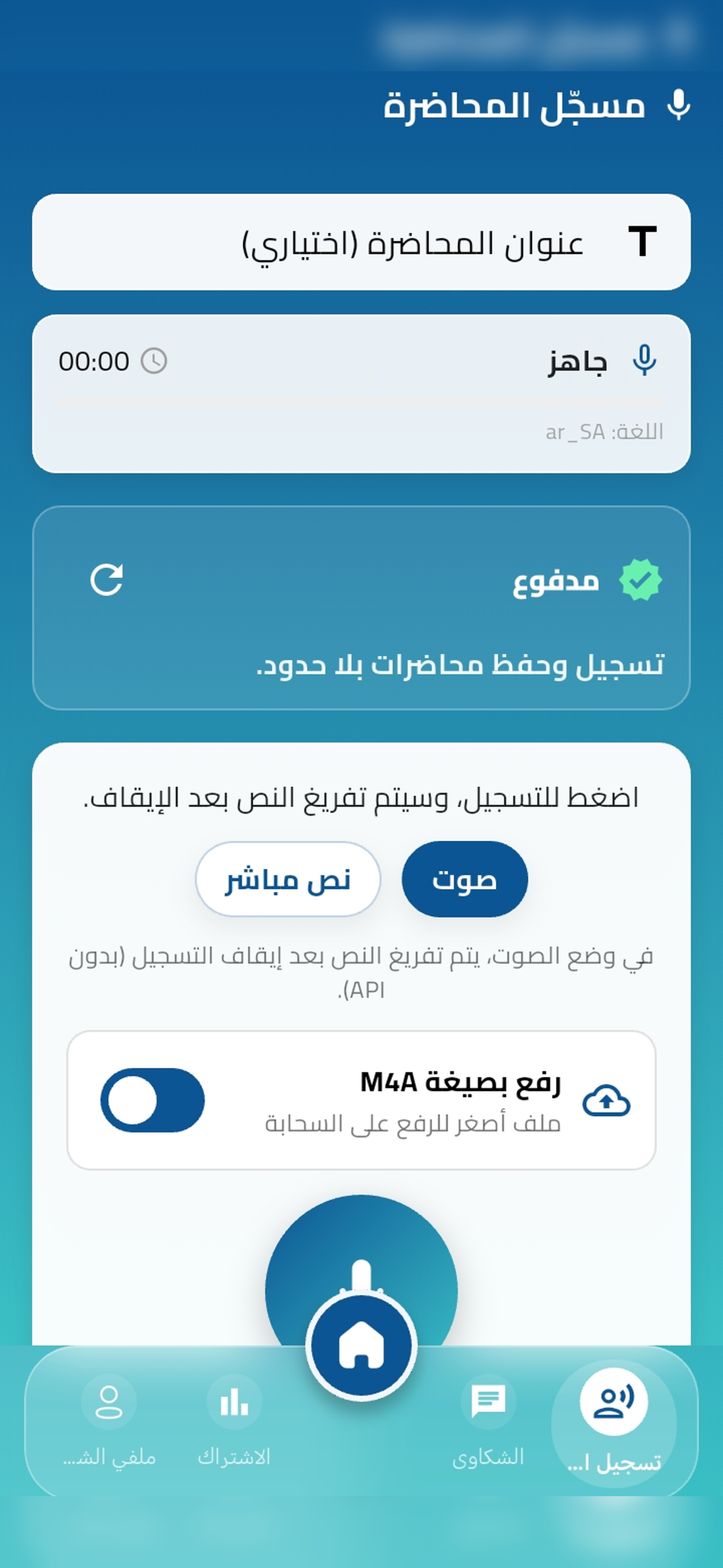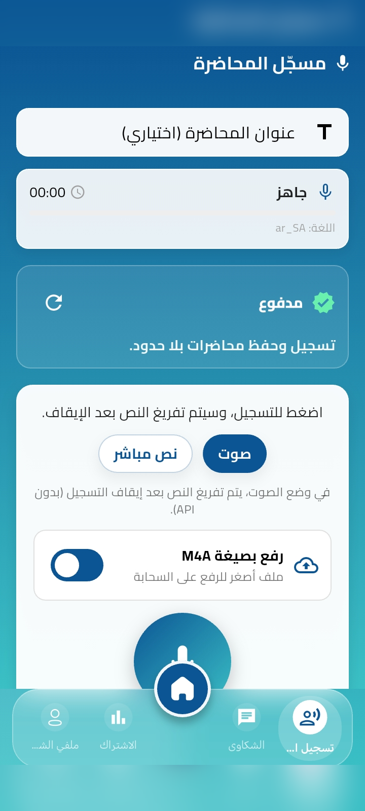 سجل المحاضرة أو فعّل التفريغ المباشر إلى نص، مع مشغل صوت وتحكم بالتقديم/الترجيع.