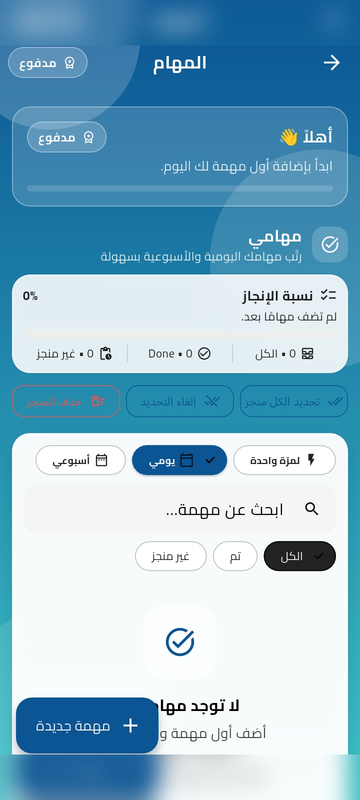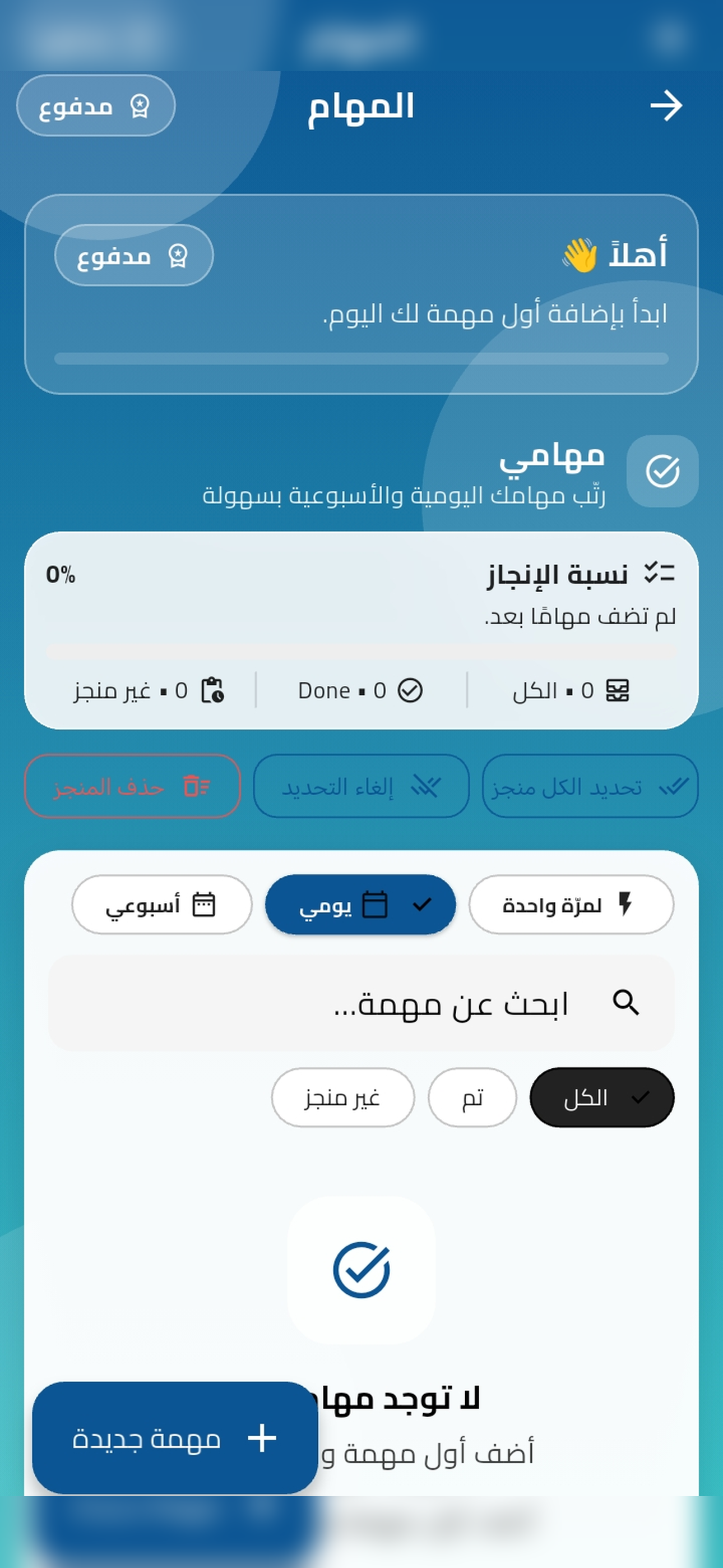 مهام مرة واحدة أو يومية/أسبوعية، مع تذكير وحالة “تم”.