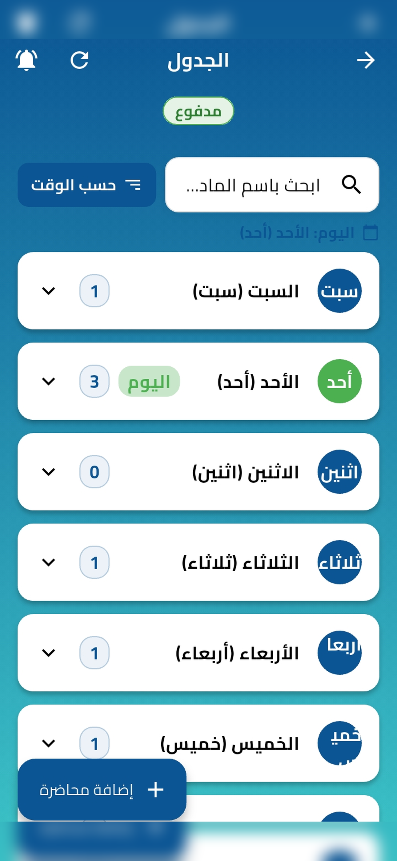 رتّب محاضراتك حسب اليوم والوقت والمكان مع تنبيهات قبل الموعد.